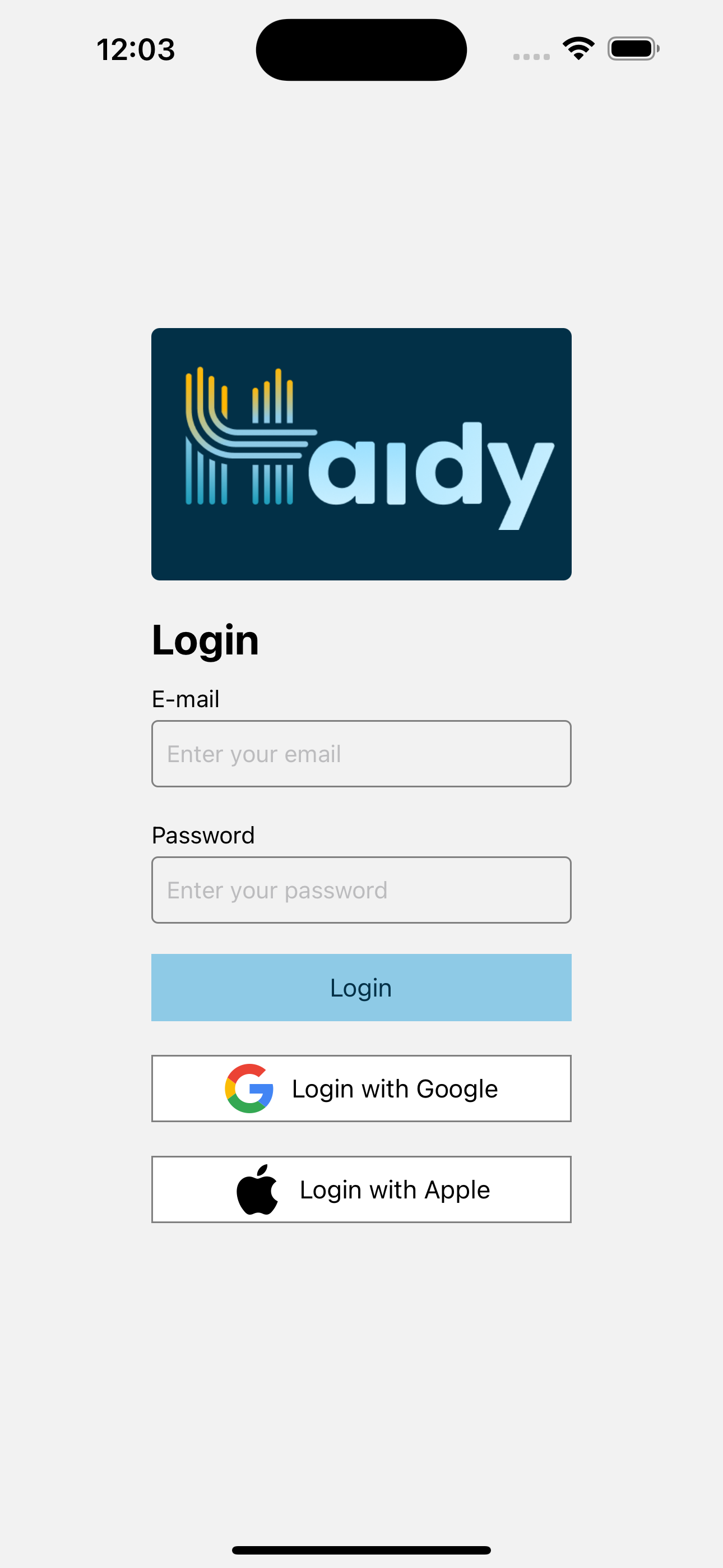 Beim ersten Öffnen von Haidy wird Ihnen der Login-Bildschirm angezeigt. Ihnen stehen mehrere Optionen zur Verfügung: